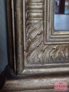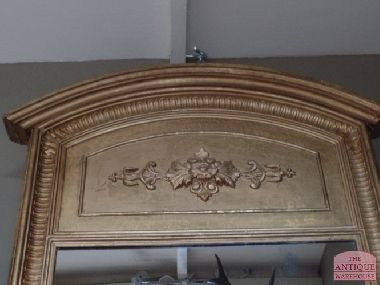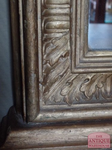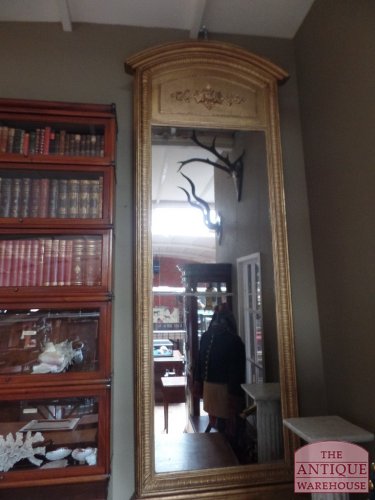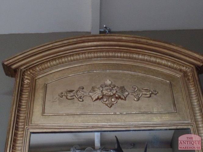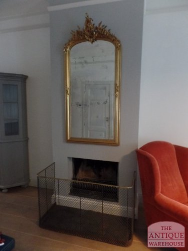 Zeer hoge en smalle antieke Franse spiegel, afmeting 94 cm breed en 251 cm hoog. mooie ornamenten top en fantastische geschulpte rand, mooi nog in zijn bladgoud.