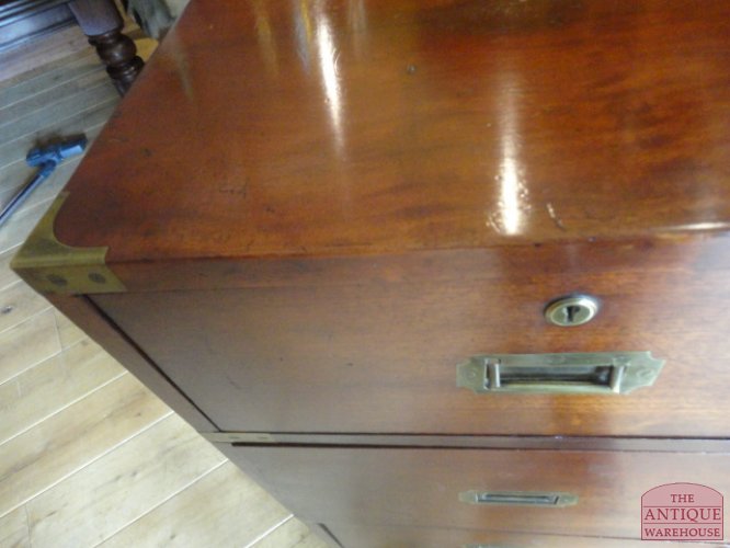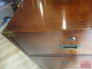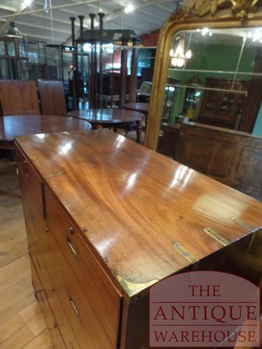 Buiten categorie mahonie Engelse military ladekast van circa 1850 in een 100 % originele staat met een fantastische kleur en patine. De afmeting van deze bijzondere ladekast is 99 cm breed, 47 cm diep en 110 cm hoog.