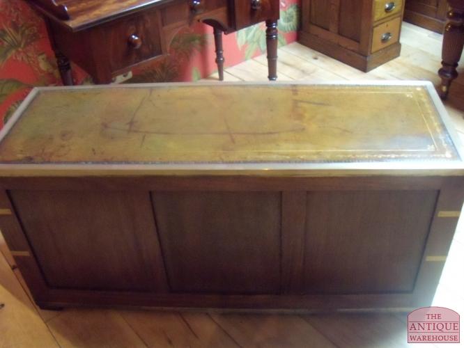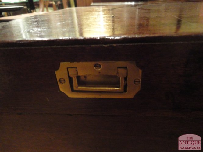Zeer fraaie kist met messing beslag, en lade aan binnenkan. de kist is van circa 1900 en gemaakt van teakhout, vaak gingen hier de persoonlijke bezittingen in van officier of hoog geplaatste ambetenaar. Afmeting 121 cm breed en 59 cm hoog en diep.