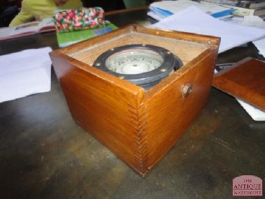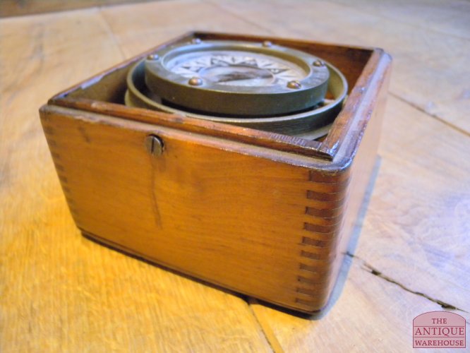 Mooi antiek kompas in een zeer fraai mahonie houten kistje, afmeting 15,5 bij 15,5 en 11,5 cm hoog.