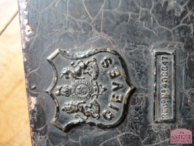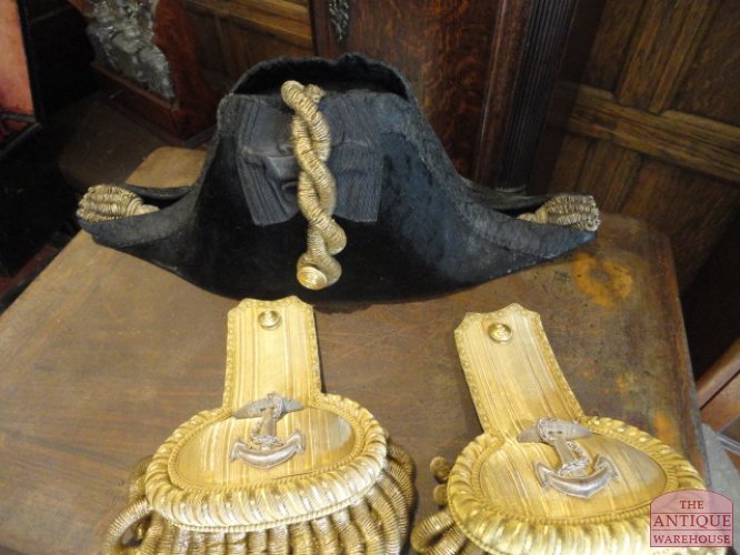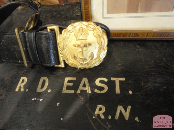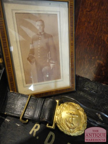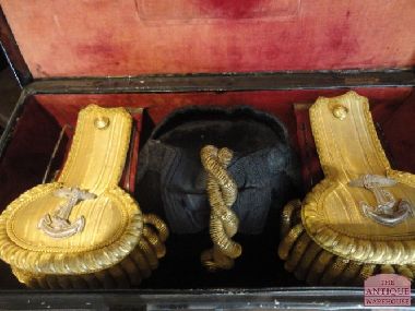 Zeer decoratieve en complete kist voorzien van antieke steek, antieke epauletten en riem. De ijzeren kist met hierop de maker Gieves, reg no 408847 is ooit het persoonlijk bezit geweest van kapitein R.D. East, foto zit ook nog in de kist. De kist is van binnen afgewerkt met een roodfluwelen stof, dit alles verkeert in een xeer goede en originele staat.