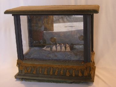 In deze vitrine zit een speeldoos en via mechanische stangetjes gaat zee en schip op en neer en speeld het oude zeemans liederen af. VERKOCHT