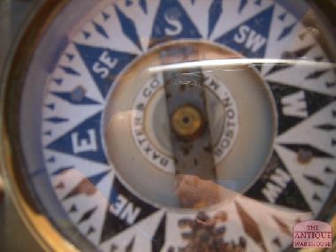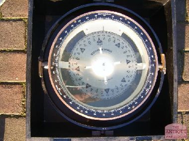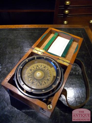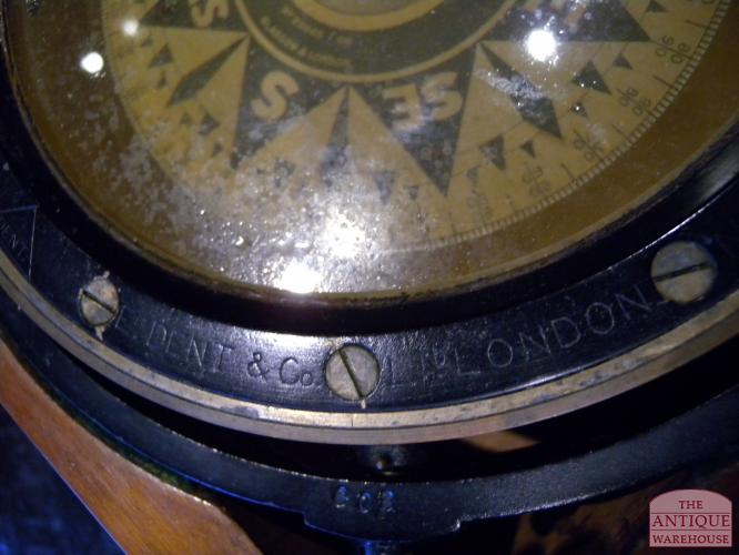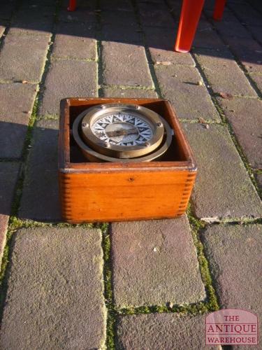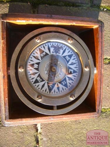 Zeer mooi en origineel Engels vloeistof kompas in mahonie kist van circa 1880/1900. De kist heeft de afmeting 27 x 27 en is 20 cm hoog voorop de kist staat het no. 809 , Patt 42 C. en de Broad arrow, deze pijl werd door de Britse overheid gebruikt om Brits eigendom te merken, is dus afkomstig van de "Britsh Navy". Het kompas zelf is gemaakt door Kelvin Bottomley & Baird Ltd met een patent van Captain Chetwynds, dit staat in het kompas zelf Op de metalen rand staat de verkoper gesigneerd nl. E. Dent te London. Prachtig bewaard gebleven. VERKOCHT
