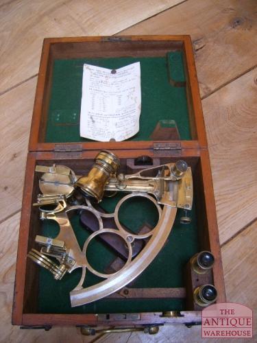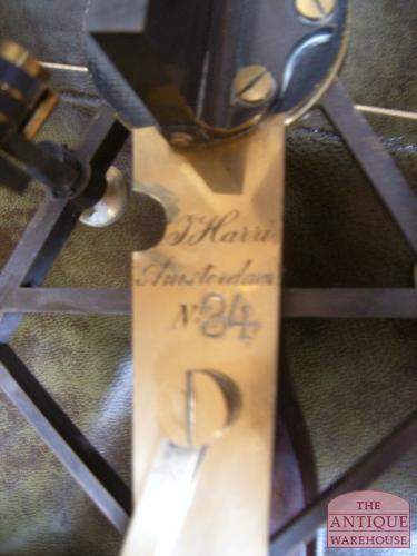 Zeer mooi, 100 % compleet en orgineel antiek sextant in top conditie. Het instrument is gemaakt door L J Harri te Amsterdam. Deze Leendert Johannes Harri, 1801 - 1875 maakte kompassen, octanten, sextanten en kijkers in de werkplaats Oude Teertuinen (vlakbij de Schreijderstoren) 446 tot 1852, hierna Oude Terrtuinen 133 (1853-1869) en vervolgens Kamperhoof 1870 - 1875. De antieke sextant zit in een handgemaakte mahonie kist (mooie handgemaakte zwaluwstaart verbindingen) Hier overheen gaat weeer een zadelleren beschermingskoffer. Het sextant is genummerd 34, wat ook weer terug te vinden is op de kist. Mooiste sextant van Nederland wat er op dit moment te koop is. VERKOCHT