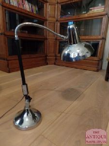 Amerikaanse staande industrie lamp die uitschuifbaar is en waar het bovenste gedeelte buigbaar is, staande op zware gietijzeren voet, valt niet om.